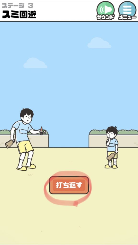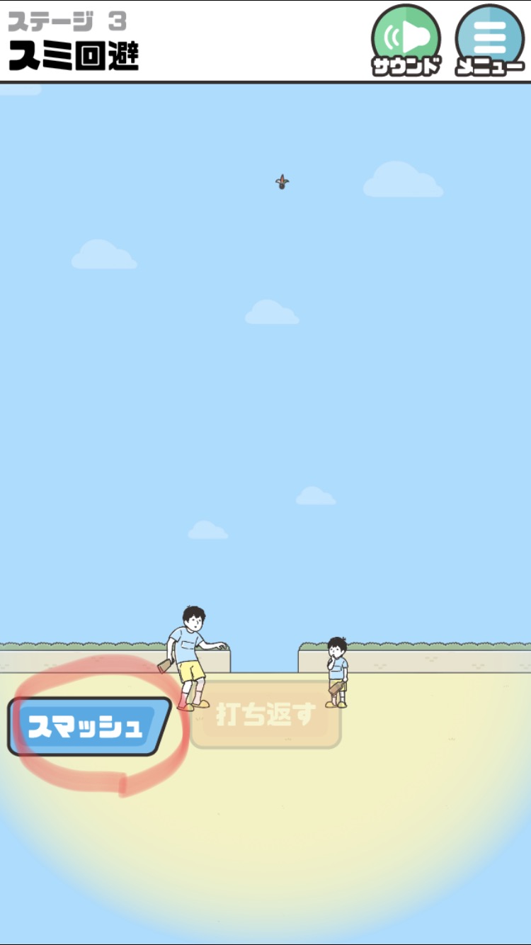 | ・スマッシュのアイコンが出て2回『打ち返す』を実施する。だんだんハネが高くなり『スマッシュ』を押す。 | クリアー |