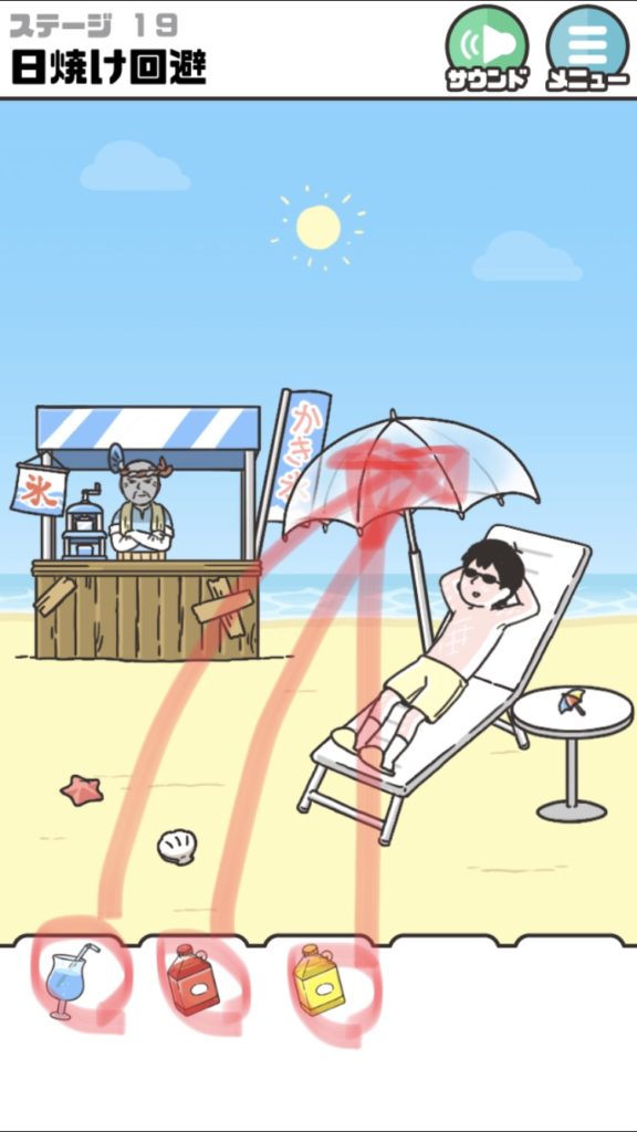 | ・右のジュースの置いてある机の脚を『TAP』して入手する。 | ・入手したパラソルを赤印の様にもっていく。 |