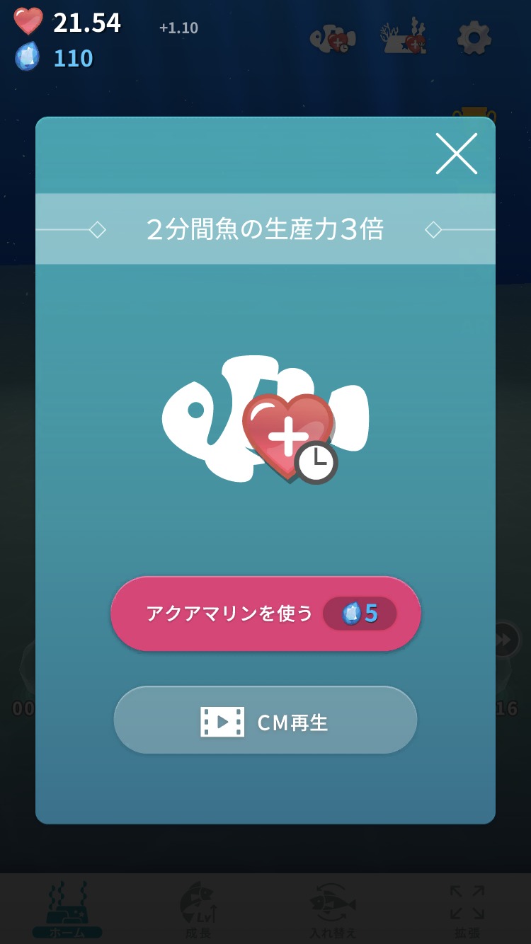 いつも画面の下にあるホーム画面、成長、入れ替え、拡張ボタンがなくなり、頑張って作った海を眺める事ができる