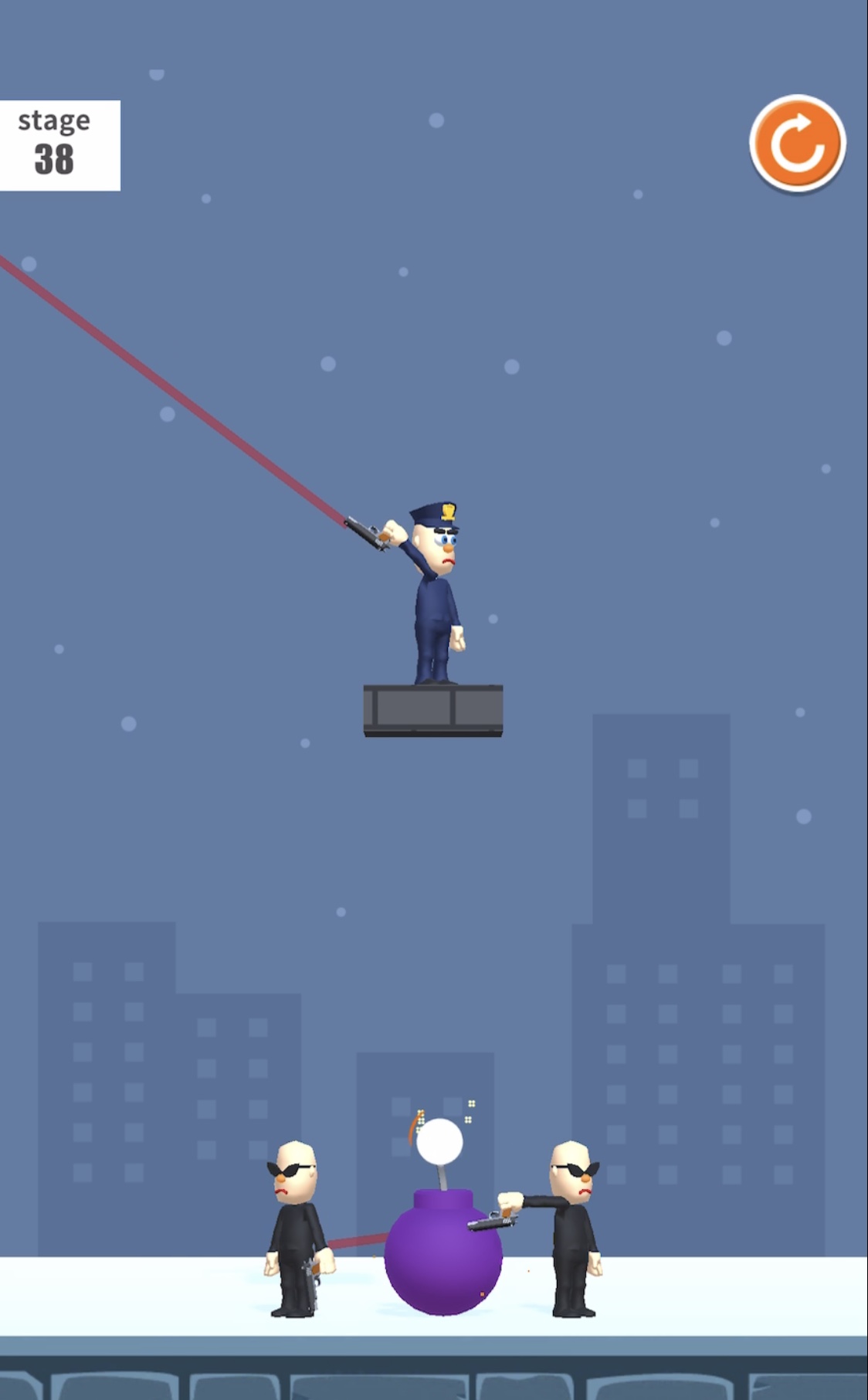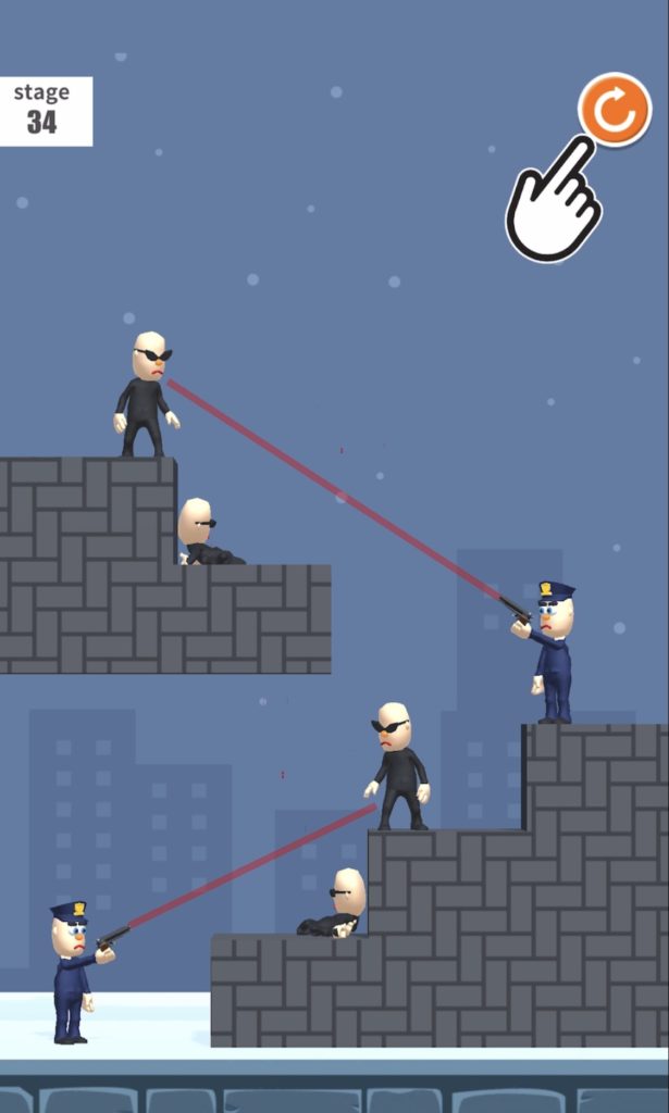 悪者が銃を持っているので悪者の銃が爆弾に当たるように操作。