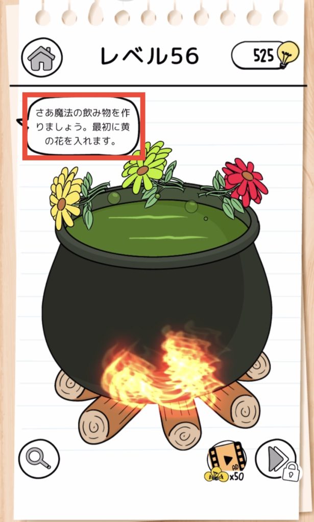 例えば上の吹き出しだと、「最初に黄の花を入れる」と書いてあるので1番左の黄の花を1本釜の中にスライドして入れる