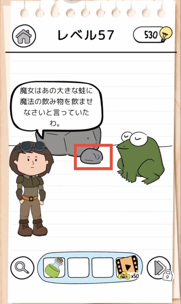 問題:魔女はあの大きな蛙に魔法の飲み物を飲ませなさいと言っていたわ。