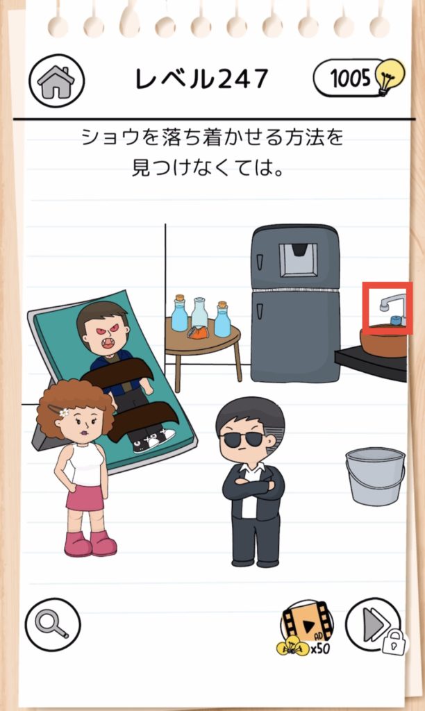 解答:金庫の中にあるテープをタップして回収。その後左矢印をタップして移動
