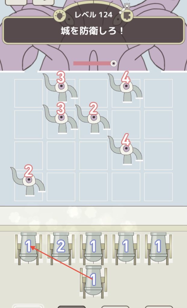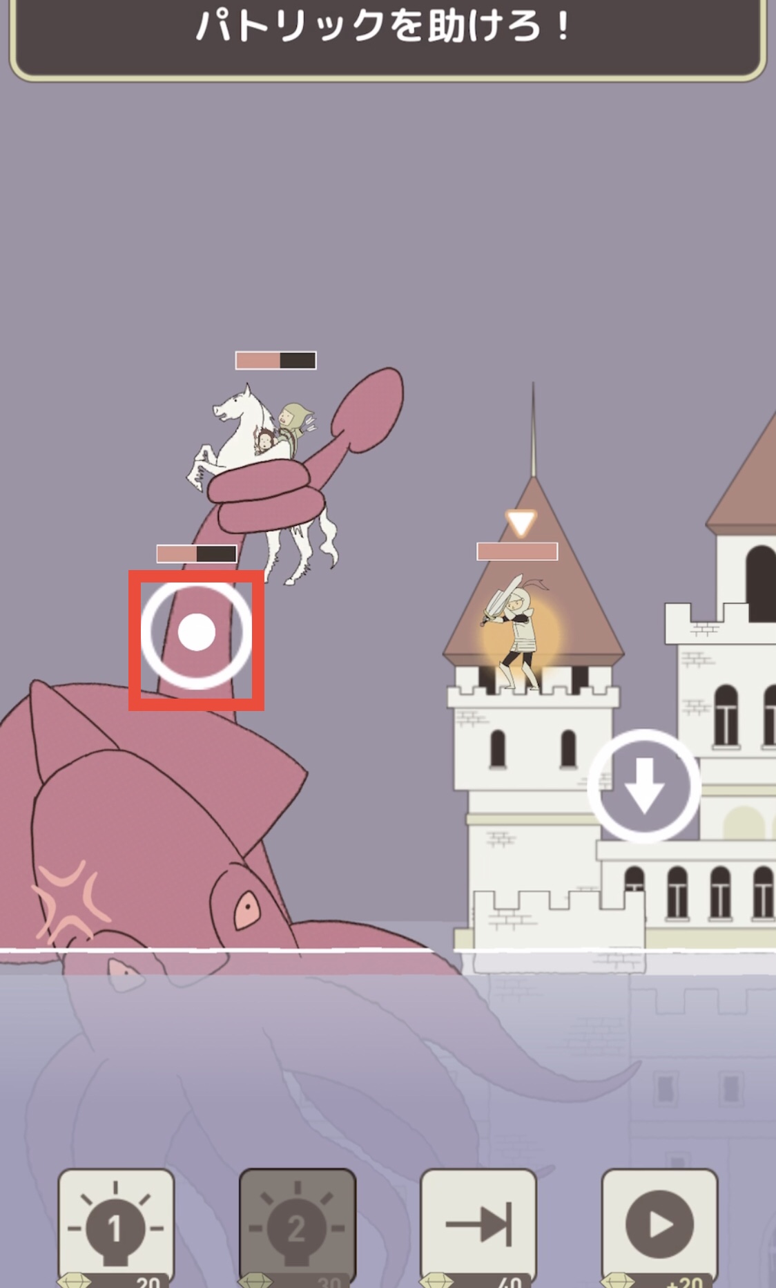 クラーケンが赤くなったら下矢印のマークをタップして騎士を回復する