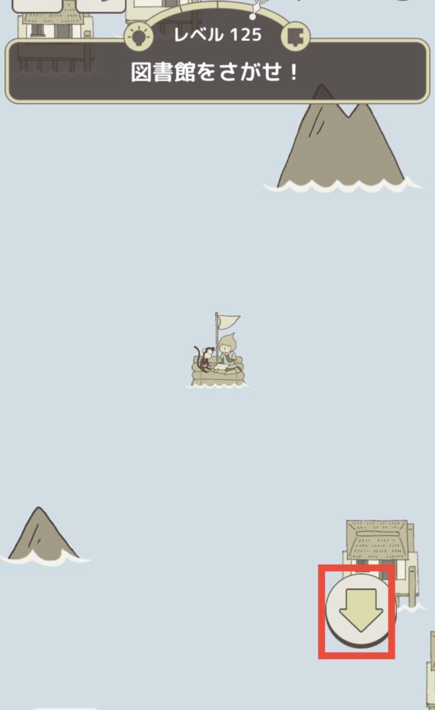 すると、山と山の間に筏が移動していくので、ちょうど間付近で下矢印のアイコンをタップする