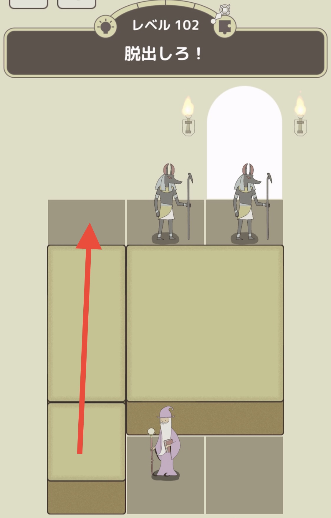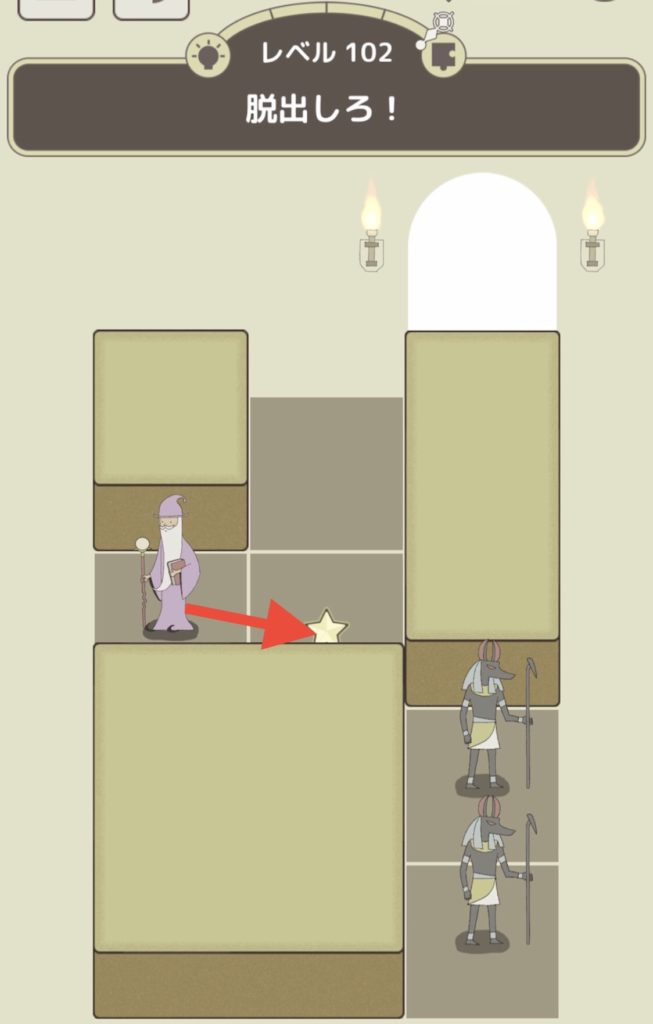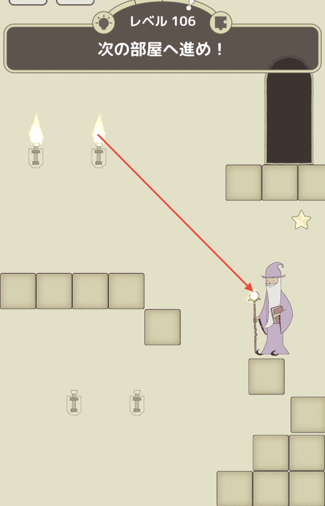 現れた階段の上に魔法使いを乗せて左側を向かせた状態のまま奥の松明の炎から杖までスワイプする