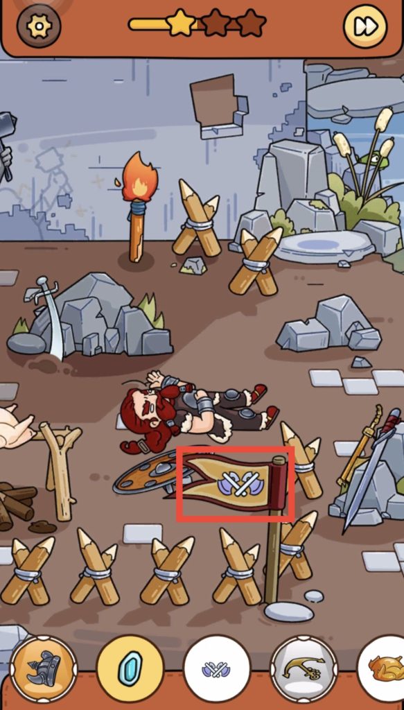 金の斧を投げつけ左画面いる男性にあたり兜が落ちる