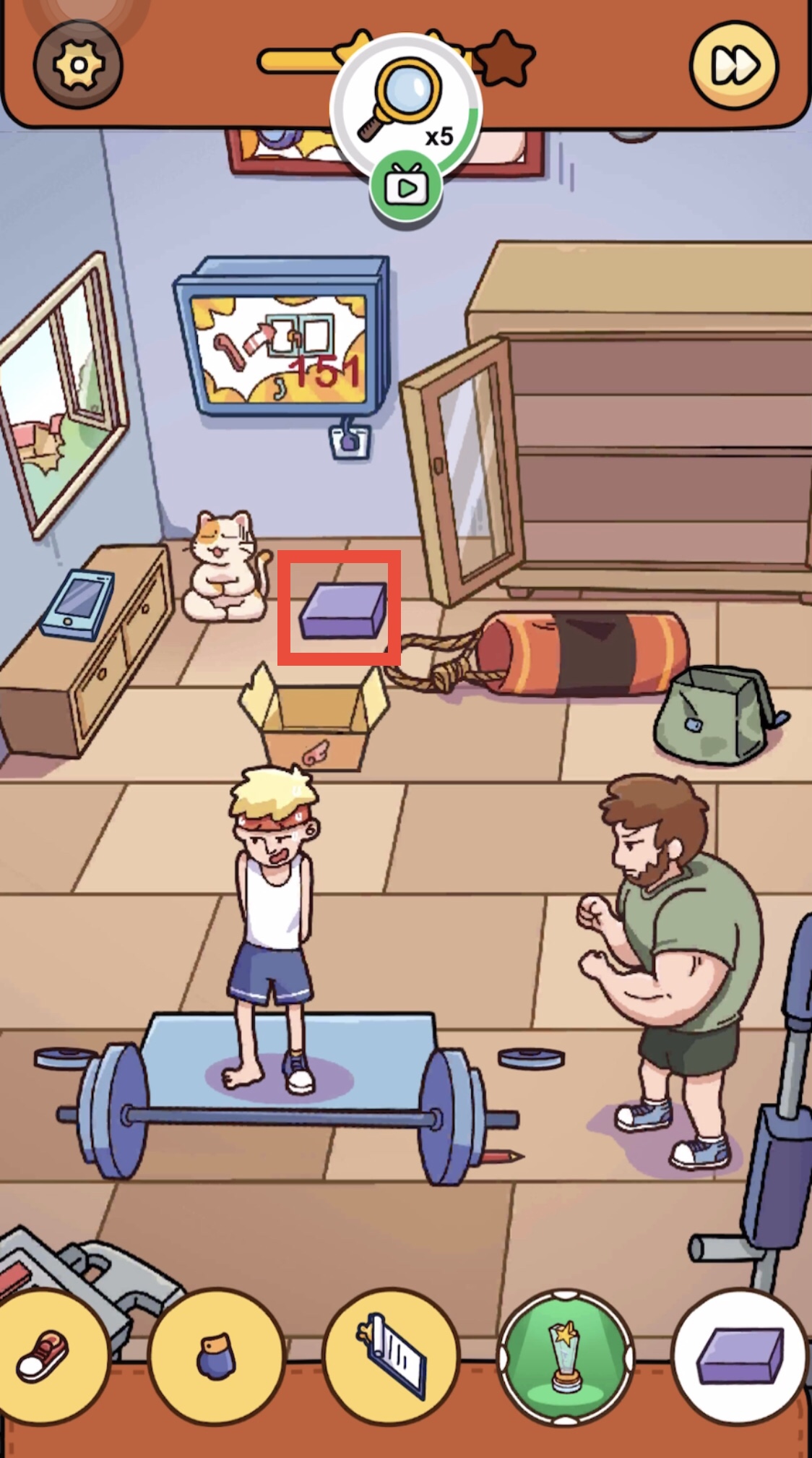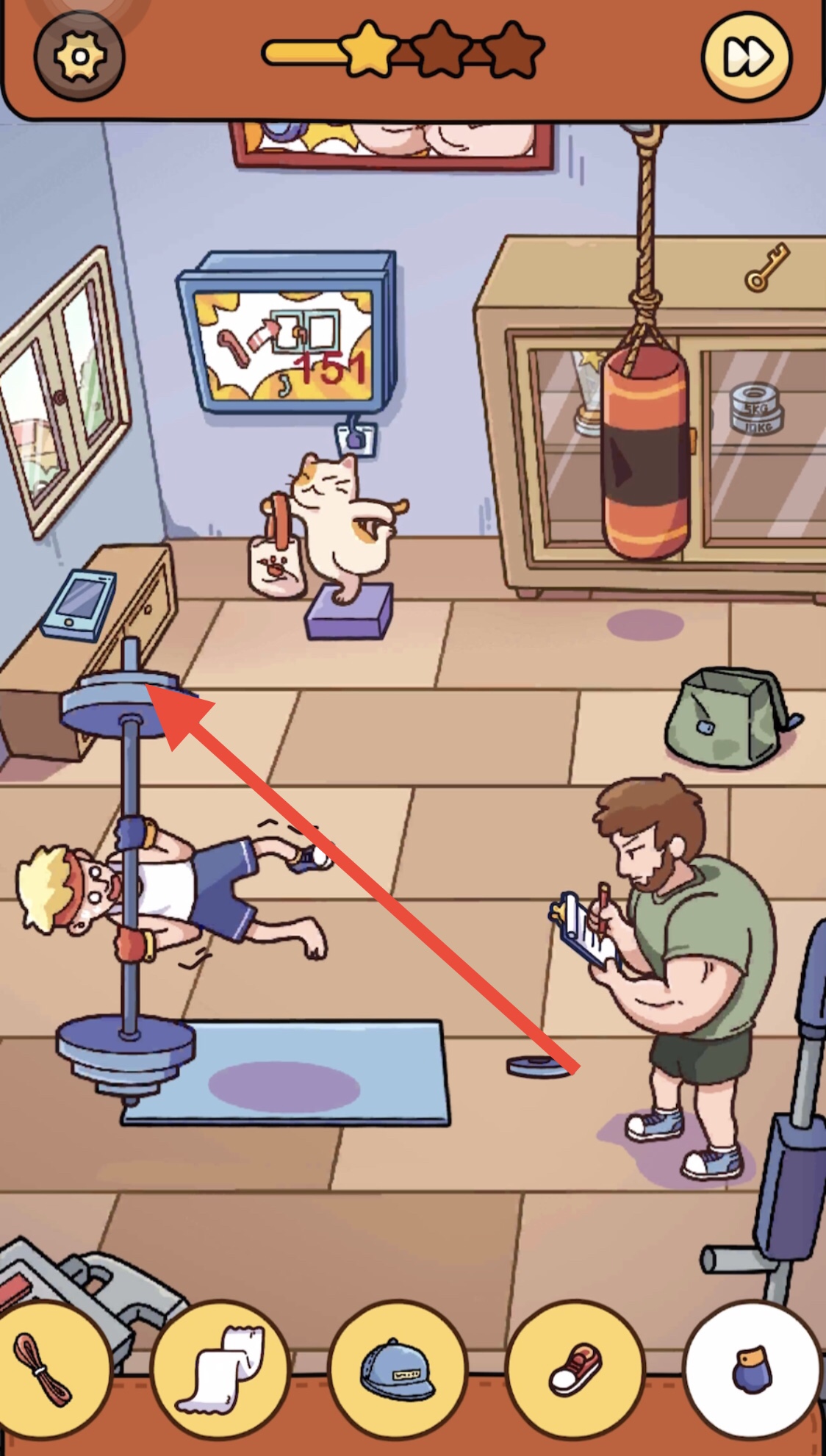蜂が入ってきて驚いた男の子がバーベルを落とす。その衝撃で驚いたマッチョが怒ってメモを落とすのでタップして回収する
