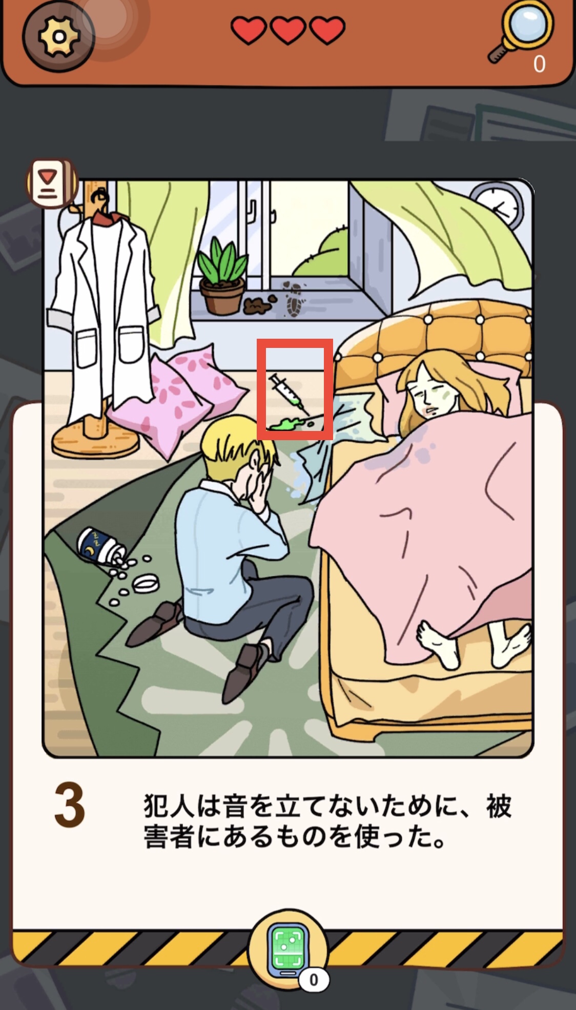 答え:窓際に落ちている注射器をタップ