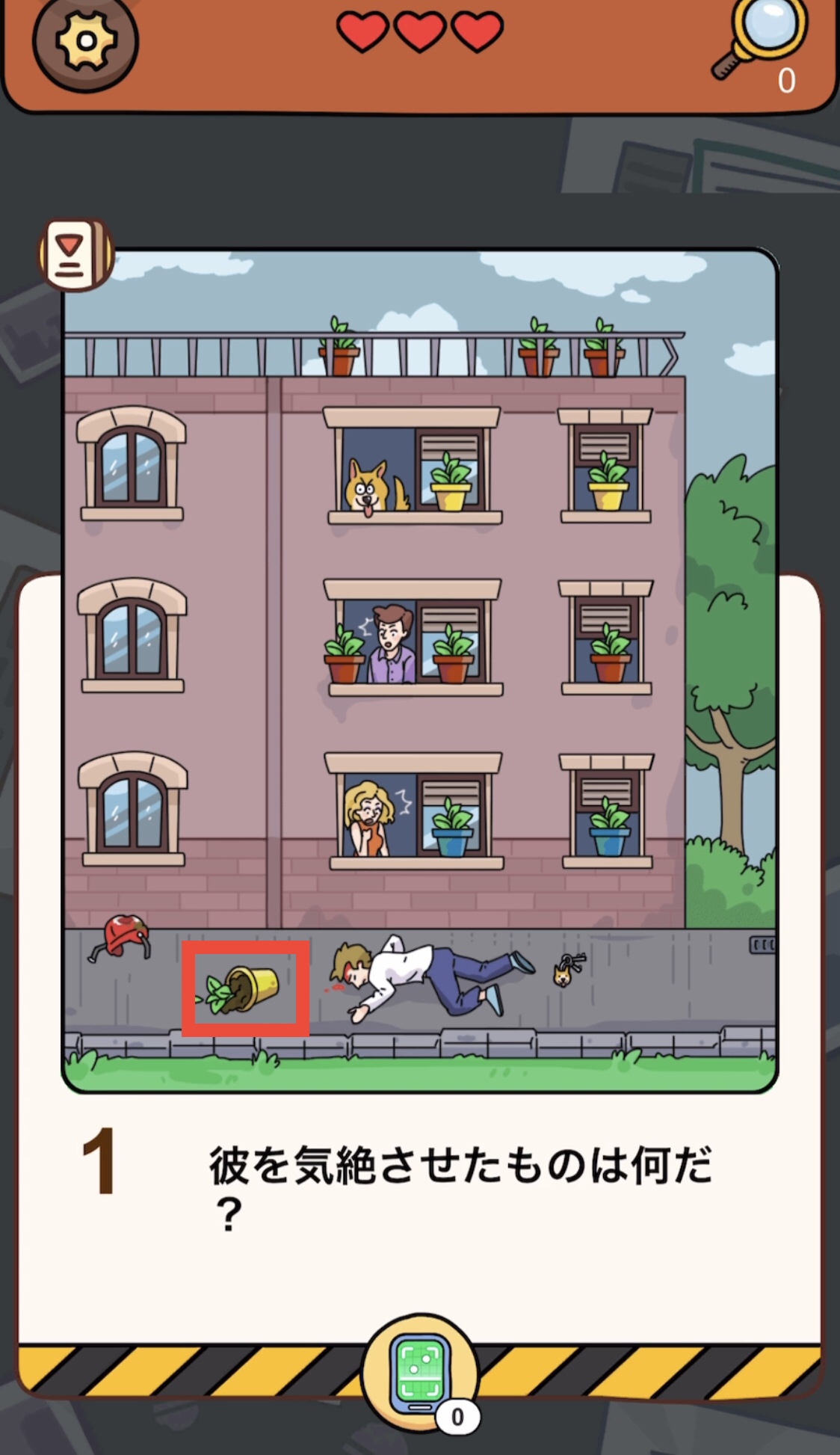 答え:3階の窓から顔を出している犬の横にある黄色の植木鉢をタップする