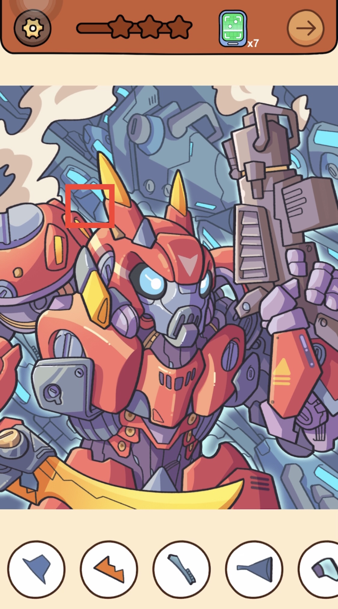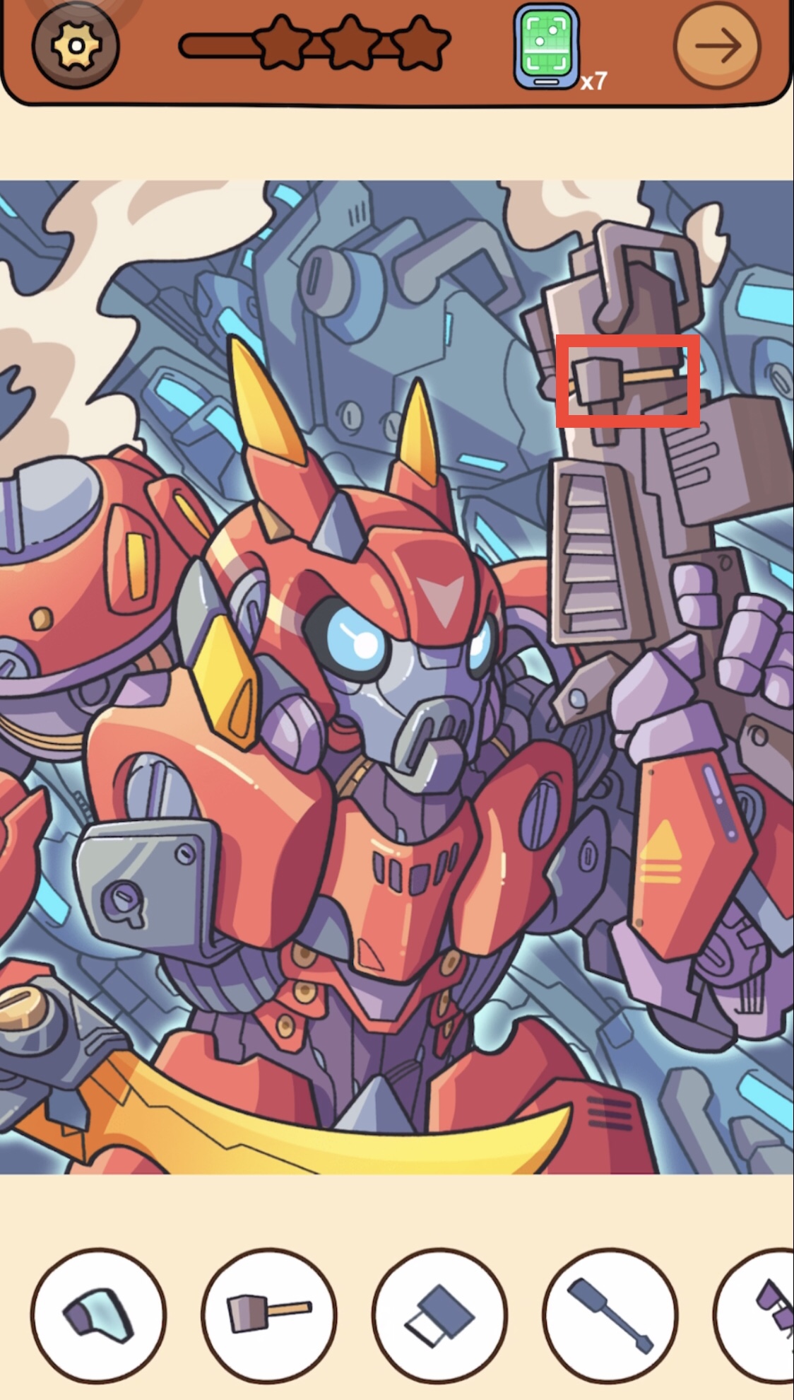 答え:ロボットの左角と銃との間に同化している部品をタップ