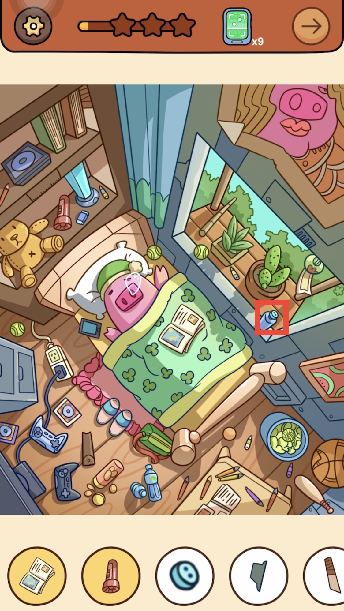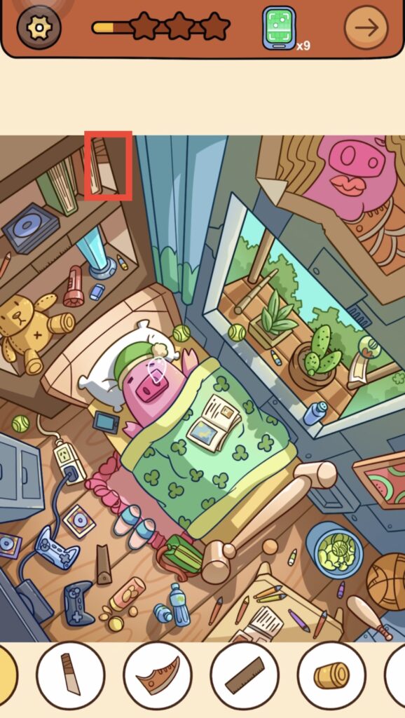 答え:ブタさんが寝てるベットの布団の上にある本をタップ