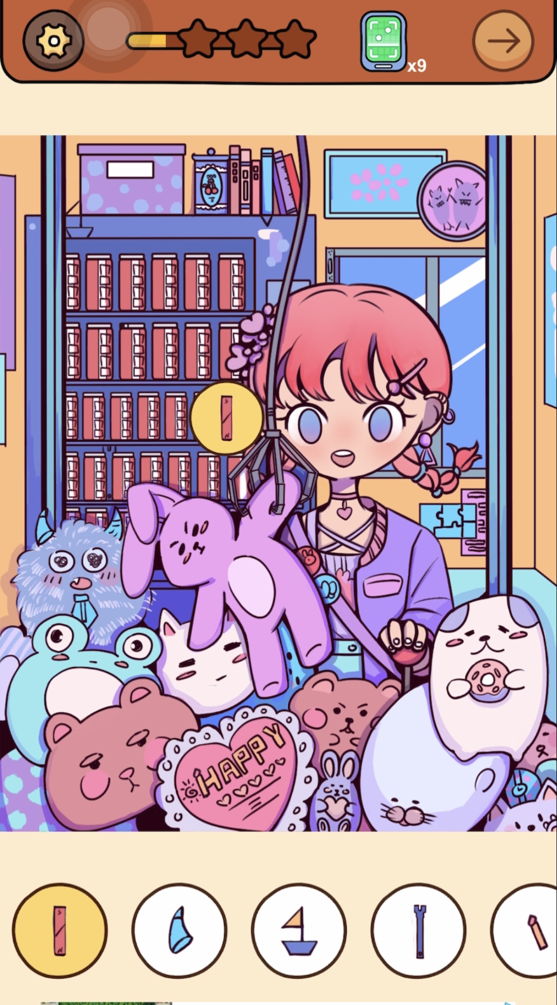 答え:画面中央付近のクレーンゲームの線と同化している部品をタップ