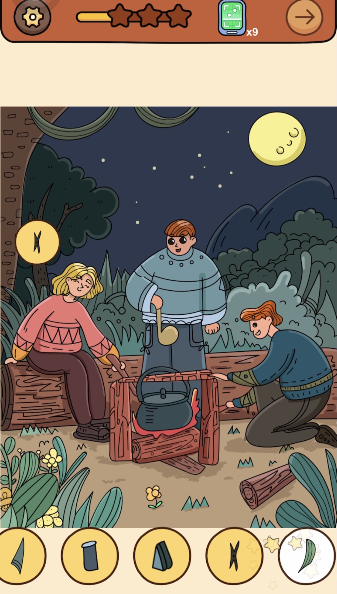 答え:女性が座っている木の一部と同化してるマークをタップ