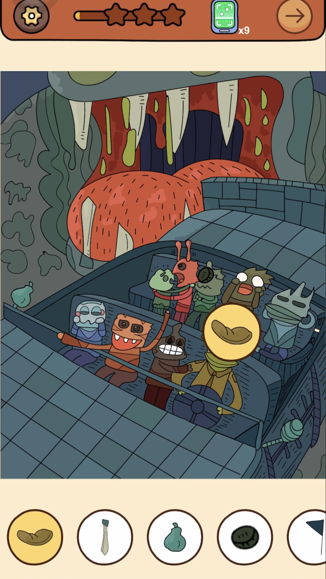 答え:車のハンドルを握っているモンスターの帽子をタップ