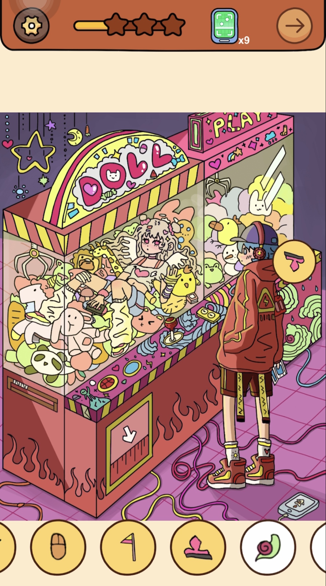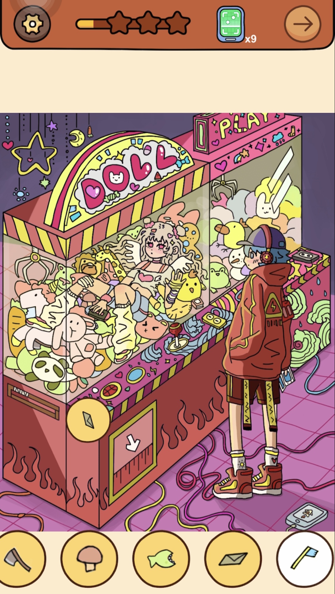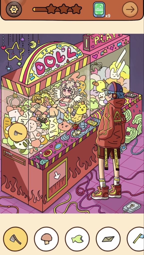答え:女の子が入ってるUFOキャッチャーのアーム付近に同化している部品をタップ