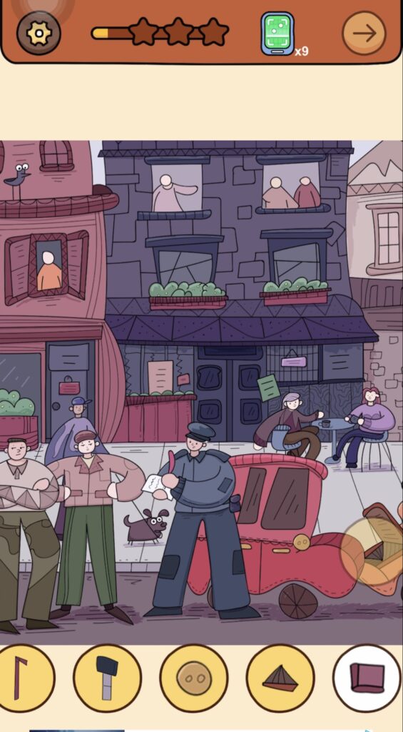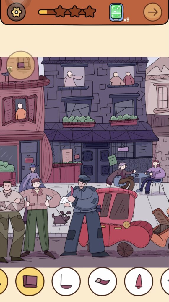 答え:右奥でティータイムを楽しんでいる紫色の服を着た女性の頭の上の建物と同化している旗をタップ
