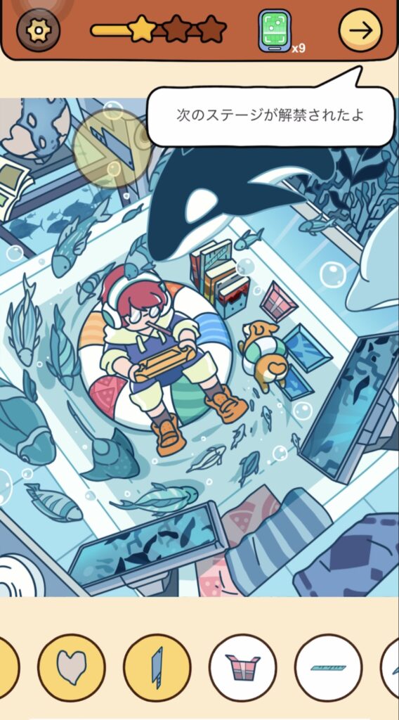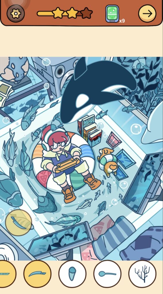 答え:シャチの真下にある並べられたほんの一部に同化している定規をタップ