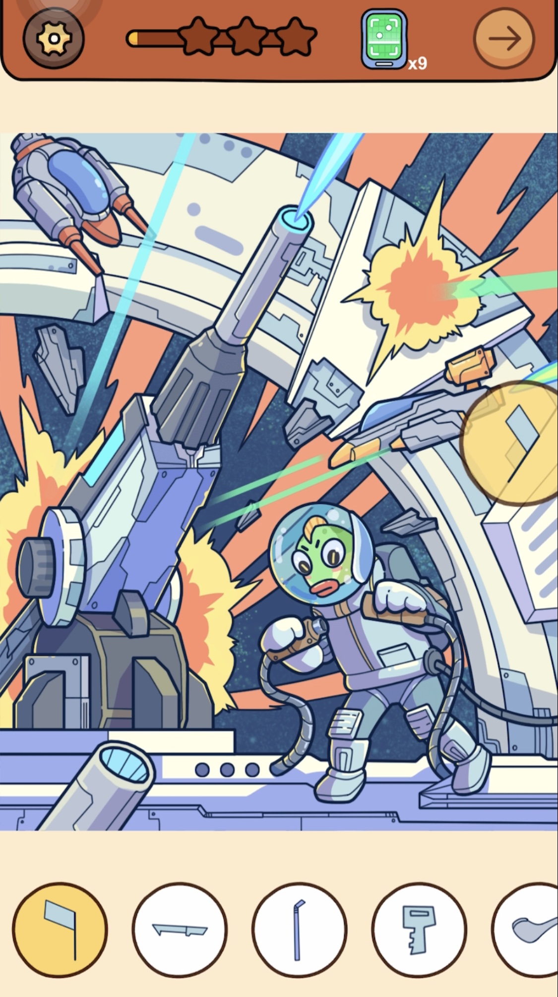 答え:宇宙服を着たエイリアンの左足付近に同化している部品をタップ