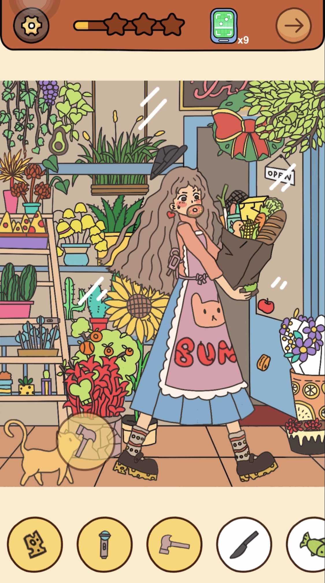 答え:画面左下の容器の一部に同化している金槌をタップ