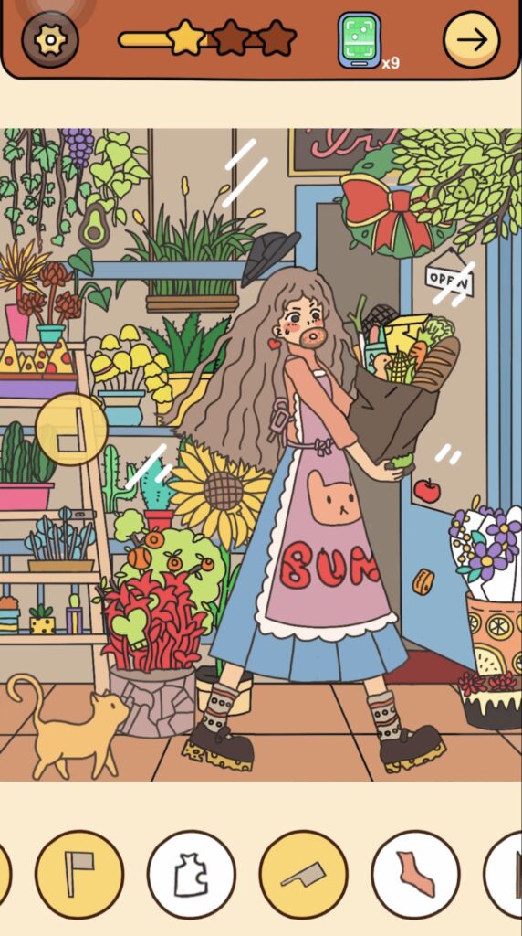 答え:画面右側の包装された花束の一部に同化している白いピースをタップ
