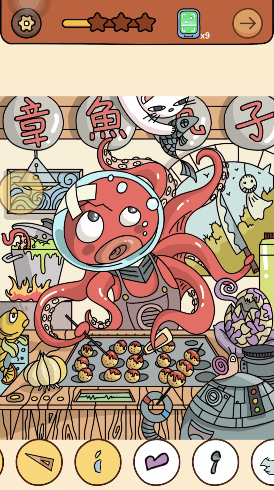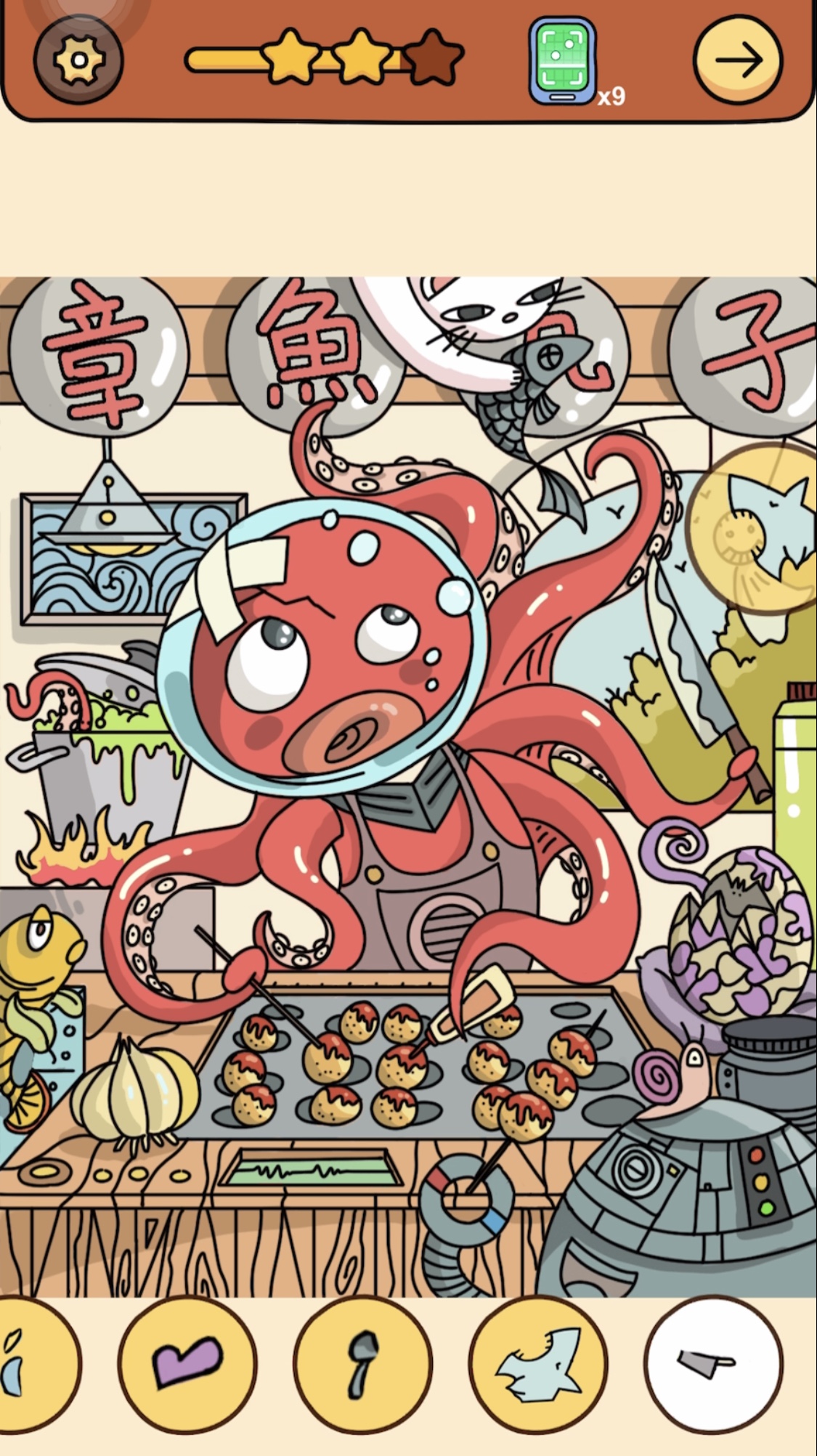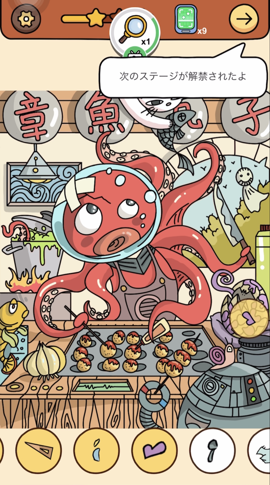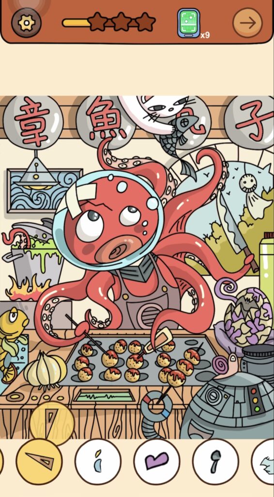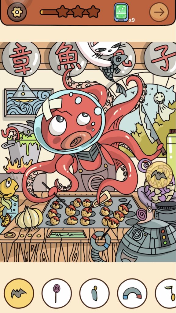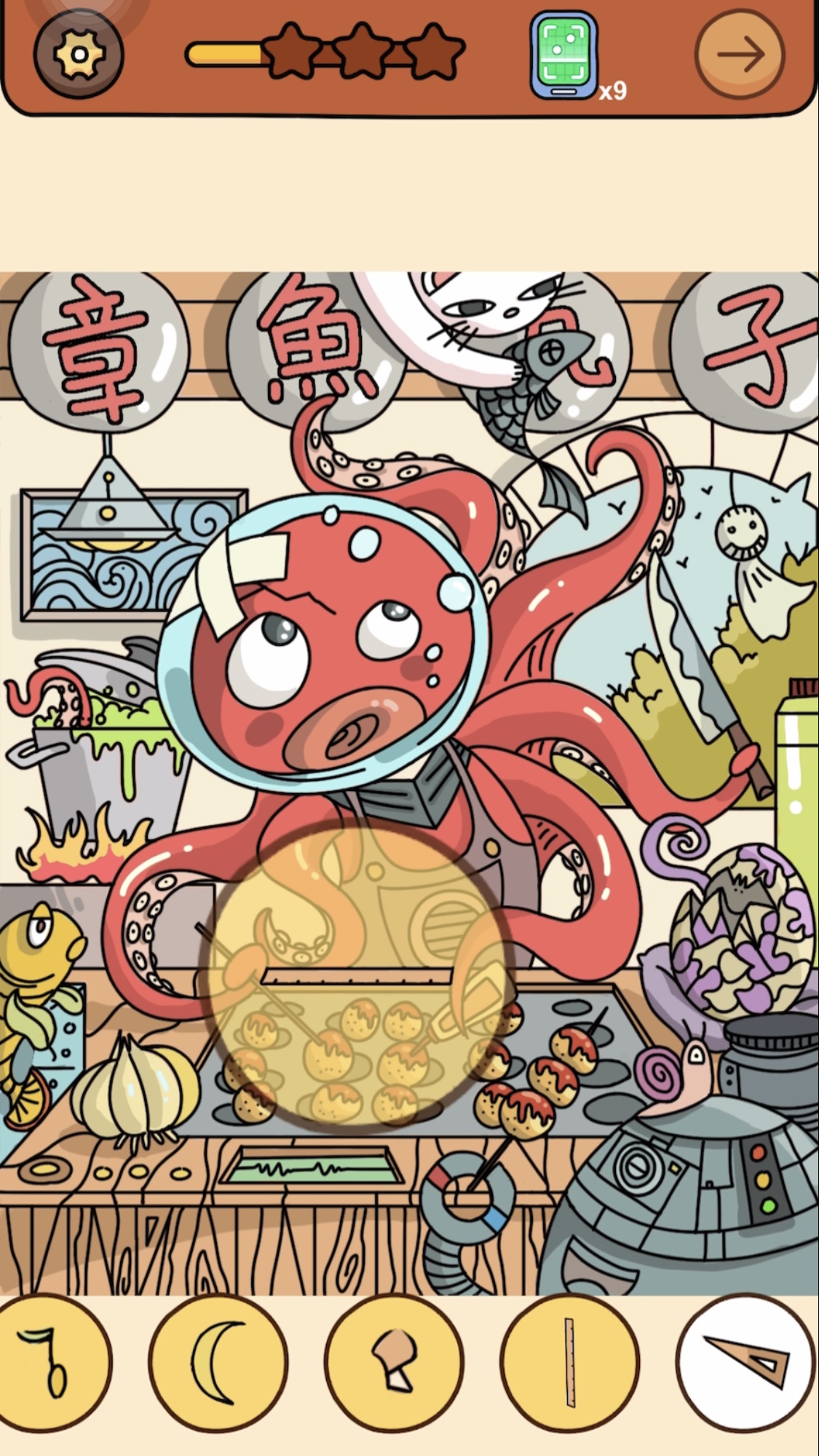 答え:黄色い魚の前に置かれているニンニクの一部に同化している三日月をタップ