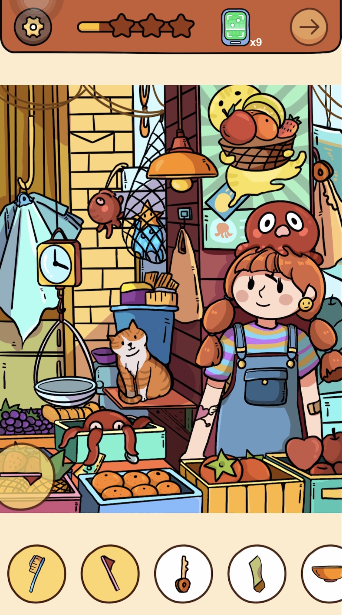 答え:小さいタコが吊り下げられている付近に同化している模様をタップ