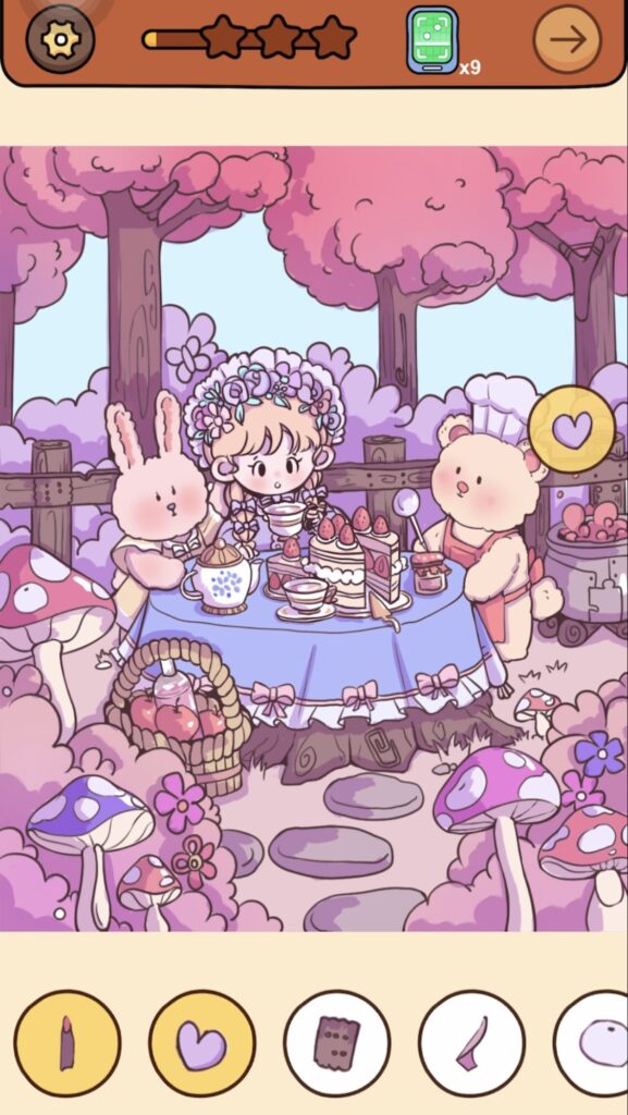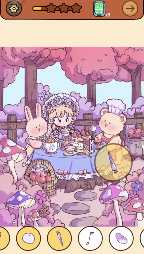 答え:テーブルの上に置いてあるケーキとジャムの間に同化している部品をタップ