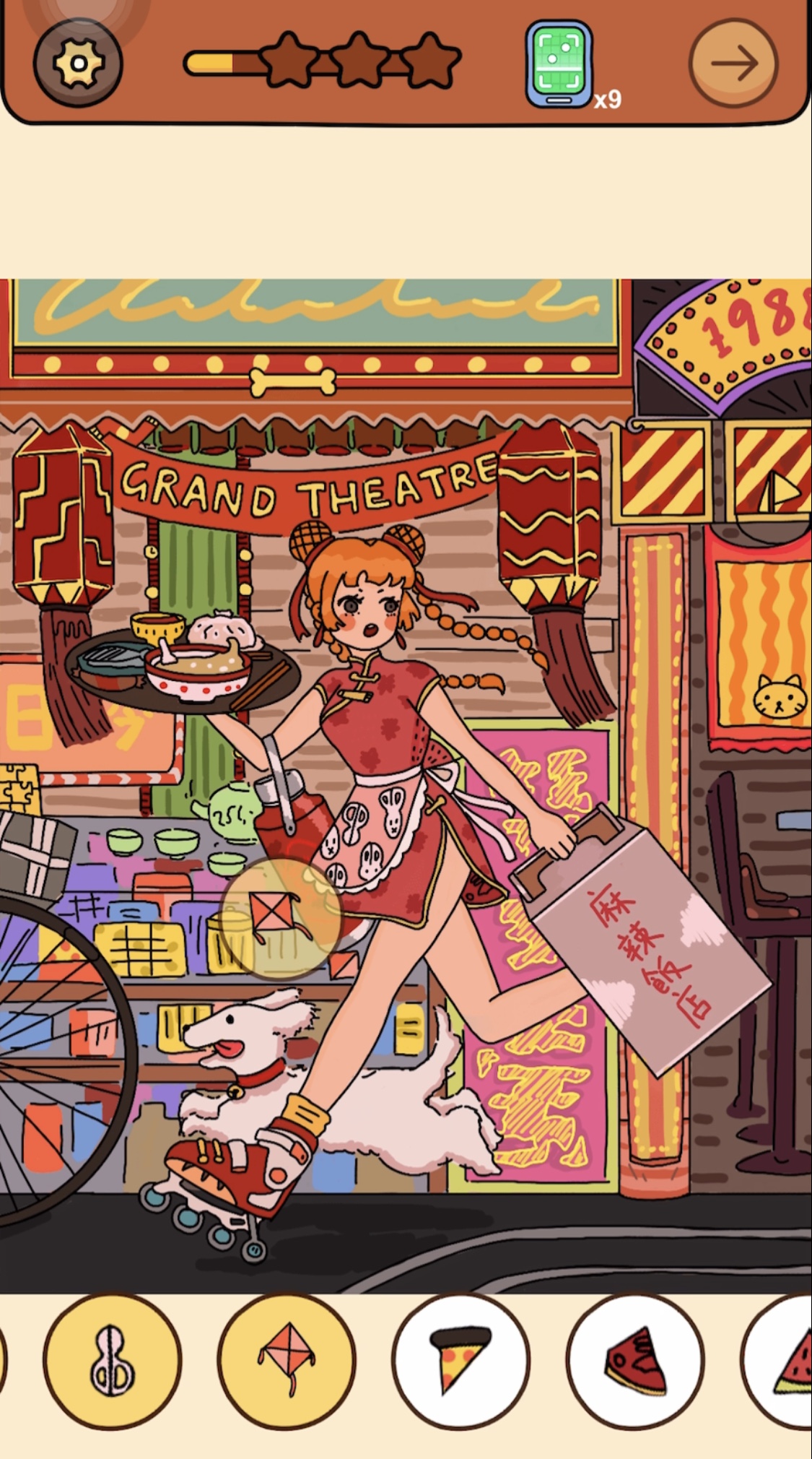 答え:女の子が持っている水筒付近に同化している小さな座布団をタップ