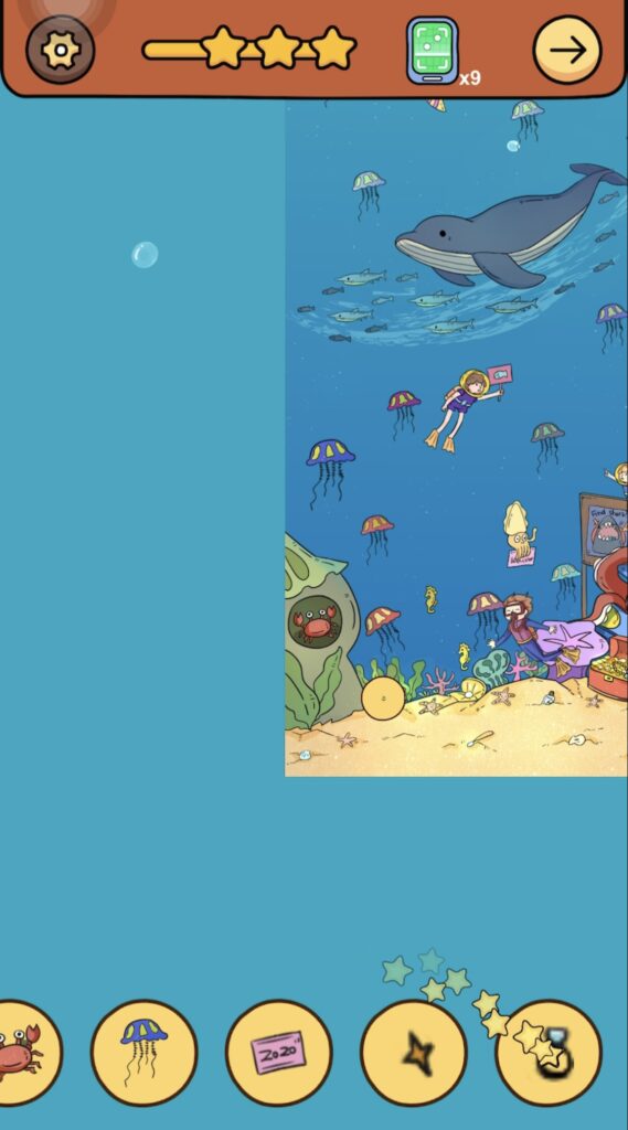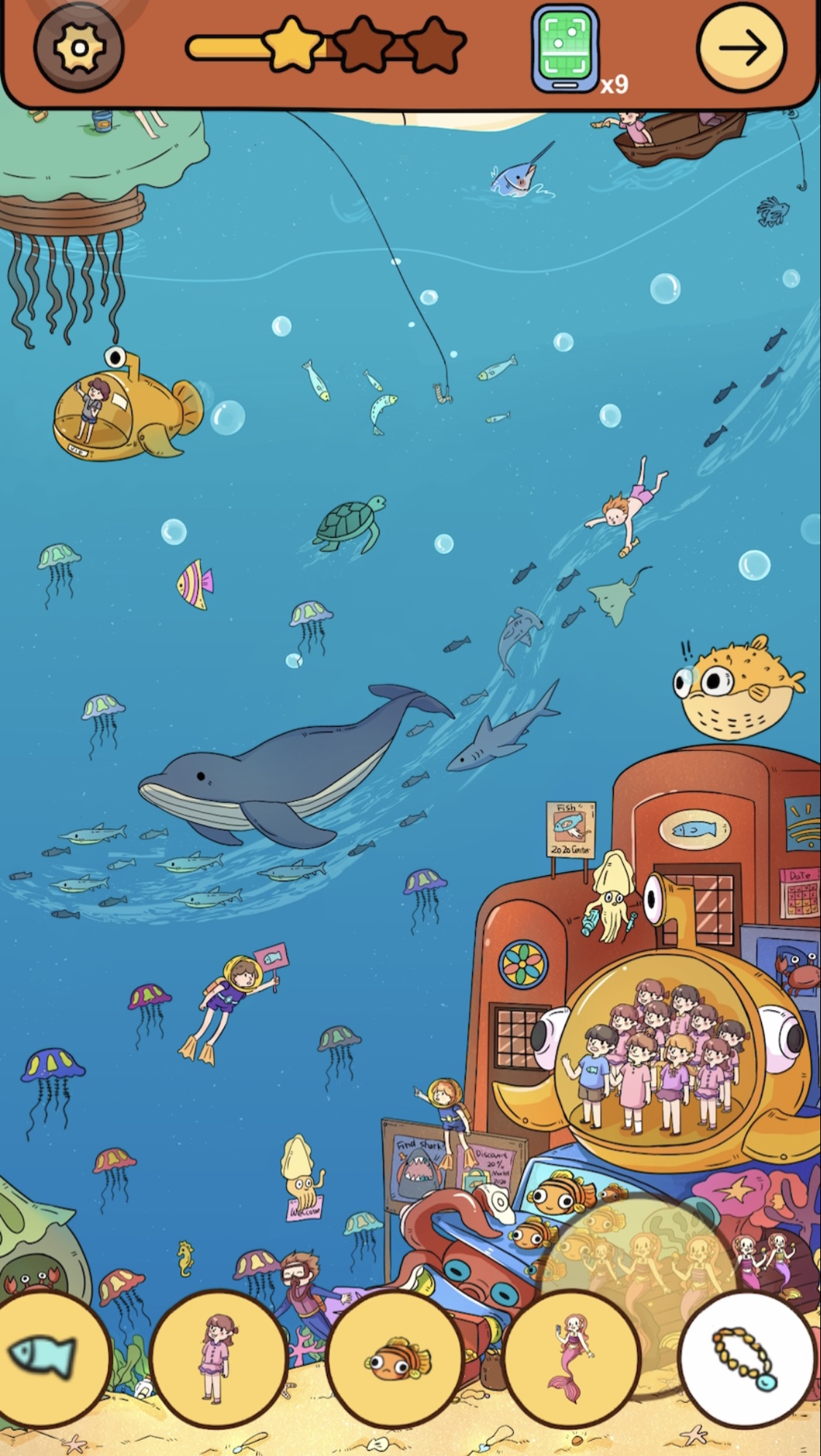 複数人乗っている潜水艦の男の子が着ている服の魚の絵をタップ